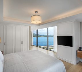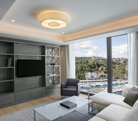 The three-bedroom Bosphorus View Residence spans approximately 292 m², perfectly framing Tarabya’s waterfront homes, green hills, the Bosphorus, and the horizon where the Black Sea meets Marmara. It features a spacious balcony, airy living areas, Miele kitchen, large dining table, three bedrooms, bathrooms with bathtub and shower, and guest WC. Access to the spa and hotel services ensures a refined long-stay experience.